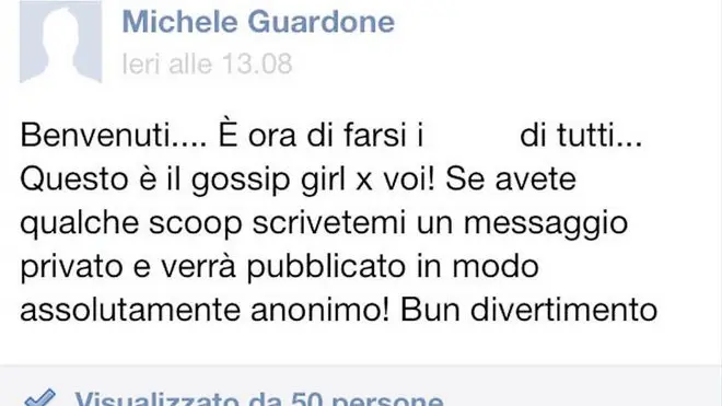 In poche ore l’iniziativa ha fatto boom, sfiorando i cento contatti e attirandosi le ire di decine di utenti. Questo il primo post pubblicato nella pagina: «Benvenuti... È ora di farsi i ca…i di tutti. Questo è il “Gossip Girl” per voi! Se avete qualche scoop scrivetemi un messaggio privato e verrà pubblicato in modo assolutamente anonimo! Buon divertimento».
