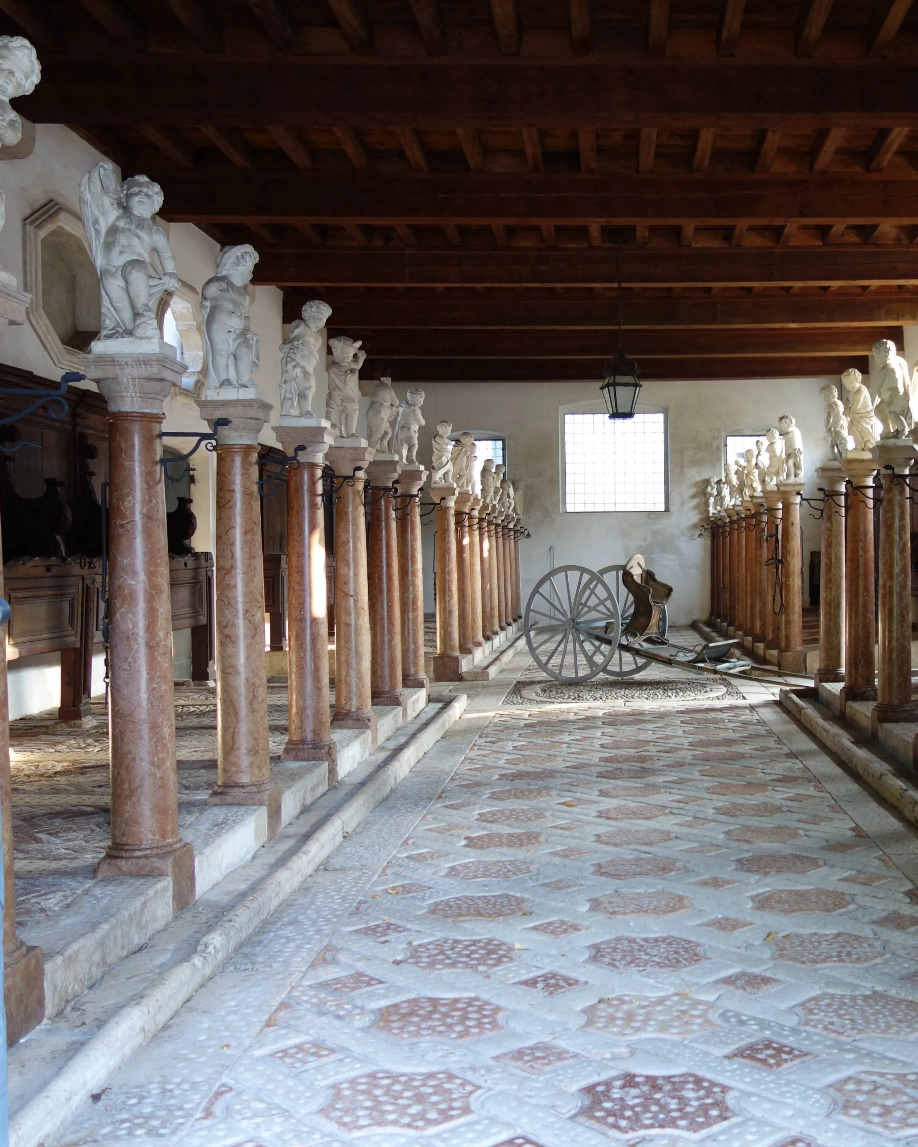 La sfarzosa scuderia settecentesca presenta 32 poste per i cavalli separate da colonne di marmo rosso di Asiago sormontate da putti in pietra tenera di Vicenza. Le antiche mangiatoie in legno sono perfettamente conservate e la pavimentazione con disegni in pietra bianca e rossa con motivo a catena è decorativa, ma aveva anche una funzione antiscivolo.