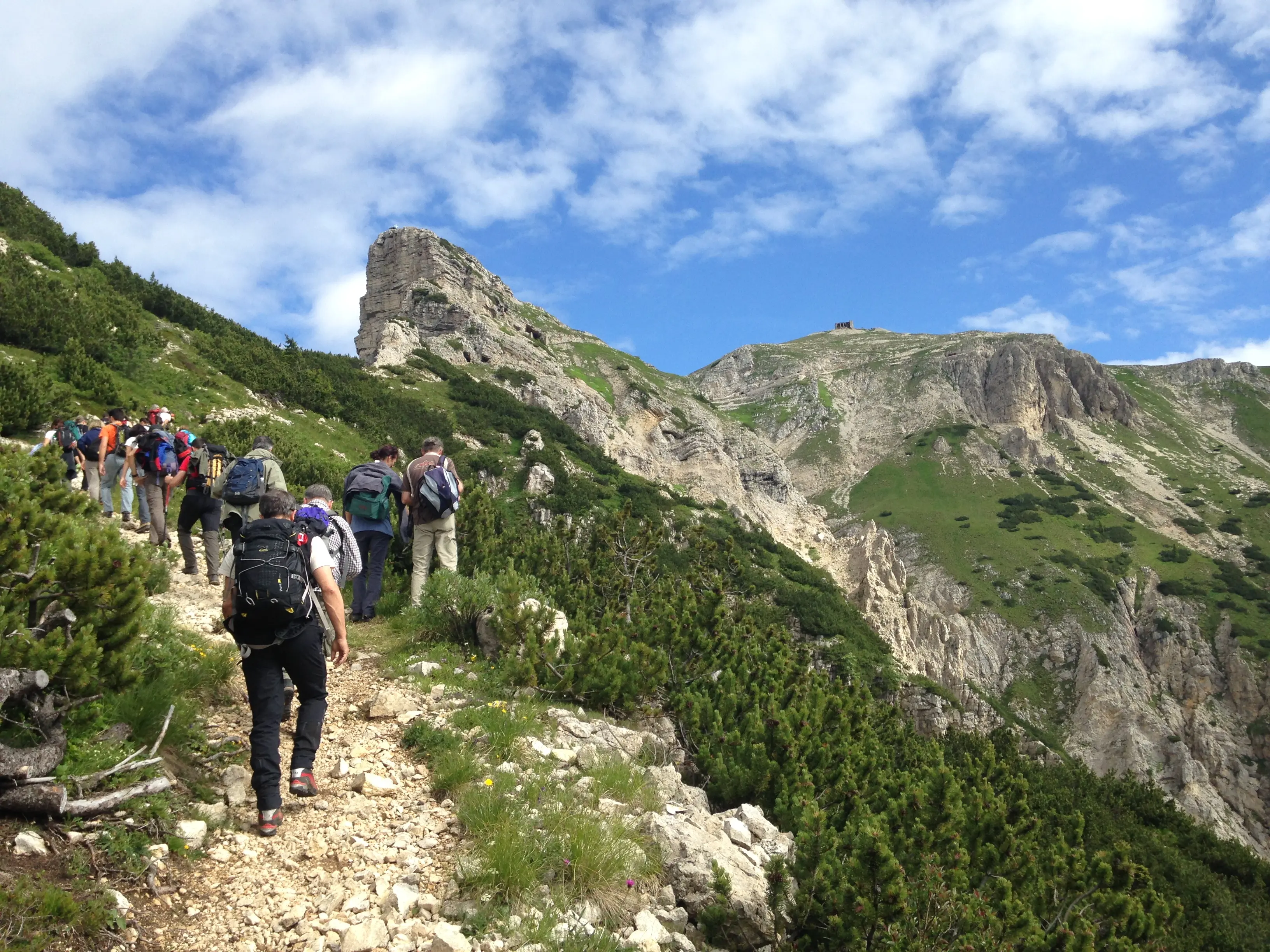 Raggiunti i 2.000 metri, quasi al termine della salita tra cielo e inferi, la sensazione è di aver abbandonato la pianura per un’altura dalle fattezze dolomitiche. Pochi passi ancora con gli zaini in spalla fino a raggiungere il rifugio Achille Papa per concedersi una meritata sosta. Per chi non conosce il percorso è consigliata la visita guidata, www.stradadelle52gallerie.it.