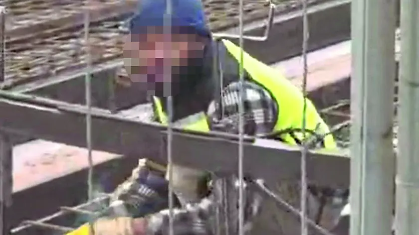 Un operaio mentre lavora in un cantiere del tram, sta eseguendo una saldatura senza utilizzare la mascherina, necessario presidio di sicurezza