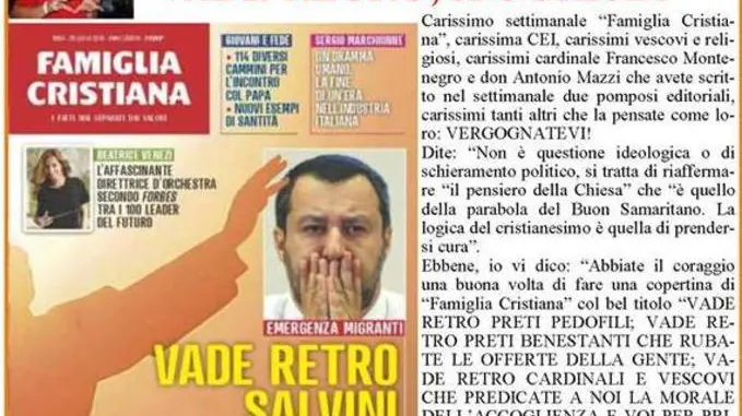 «Abbiate il coraggio una buona volta di fare una copertina di Famiglia Cristiana col bel titolo “Vade retro preti pedofili; Vade retro preti benestanti che rubate le offerte della gente; Vade retro cardinali e vescovi che predicate a noi la morale dell’accoglienza e voi per primi nei vostri lussuosi mega appartamenti e attici non ospitate nessuno; Vade retro preti del giudizio; Vade retro ipocrita Famiglia Cristiana”», scrive il sacerdote.