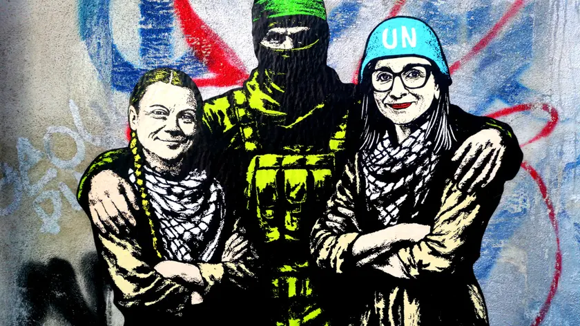 A Roma murale con Thunberg, Albanese e miliziano di Hamas