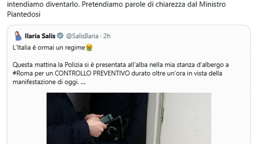 (ANSA) - ROMA, 28 MAR - "Questa mattina Ilaria Salis, nostra eurodeputata, ha denunciato di essere stata svegliata da due agenti di polizia che si sono presentati nella sua camera d'albergo a Roma per effettuare un 'controllo preventivo'. Nonostante lei si sia qualificata subito gli agenti hanno atteso quasi un'ora prima di andare via. Si tratta di una vicenda di una gravità inaudita, ancora peggiore perché avvenuta a poche ore dalla grande manifestazione di oggi pomeriggio". Lo affermano Angelo Bonelli e Nicola Fratoianni di Avs, in una nota. "È inaccettabile che in Italia - proseguono i leader rossoverdi - una parlamentare sia sottoposta a controlli preventivi. Il governo Meloni ha deciso di sottoporre a controlli i parlamentari di opposizione? Non siamo ancora diventati l'Ungheria di Orban e non intendiamo diventarlo. Su questa vicenda pretendiamo parole di chiarezza dal Ministro Piantedosi". (ANSA).
