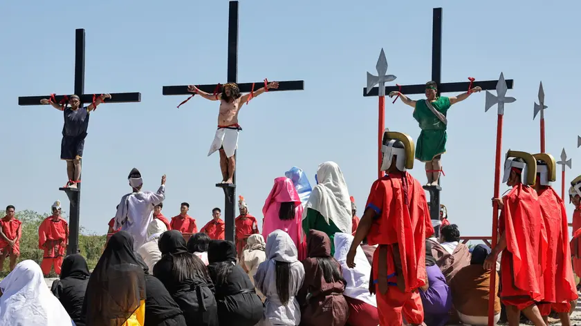 (ANSA) - MANILA, 03 APR - Centinaia di filippini e turisti si sono radunati in occasione del ;;Venerdì Santo per assistere alla manifestazione religiosa più cruenta del Paese, con una partecipazione massiccia anche quest'anno, nonostante l'aumento dei prezzi del carburante in un Paese che affronta un'emergenza energetica. Decine di uomini a torso nudo, con il volto coperto da panni, hanno camminato scalzi per le strade polverose di San Fernando, nella provincia di Pampanga, a nord-ovest di Manila, fustigandosi la schiena con fruste di bambù sotto il caldo torrido. I giornalisti hanno osservato i fedeli che si trafiggevano deliberatamente la pelle con schegge di vetro attaccate a piccole tavolette di legno per assicurarsi di sanguinare durante il rituale, un modo per purificarsi dai peccati e sperare in un miracolo. "Lo faccio per pregare per la guarigione del mio bambino di sette mesi, che ha la polmonite", ha detto John David, frusta in mano, all'inizio della processione. "Mio nonno ha iniziato, poi mio padre, e ora tocca a me", ha aggiunto il 49enne. "Nel corso degli anni, ho assistito a miracoli di guarigione attraverso questo atto di fede". Questo spettacolo annuale, che commemora la Passione, la crocifissione e la morte di Gesù Cristo in questo Paese a maggioranza cattolica, attira in genere 12.000 spettatori, turisti e residenti. In tanti hanno assistito al momento culminante dell'evento: quando ai fedeli vengono conficcati dei chiodi lunghi circa otto centimetri nei palmi delle mani prima di essere issati su una croce. (ANSA).