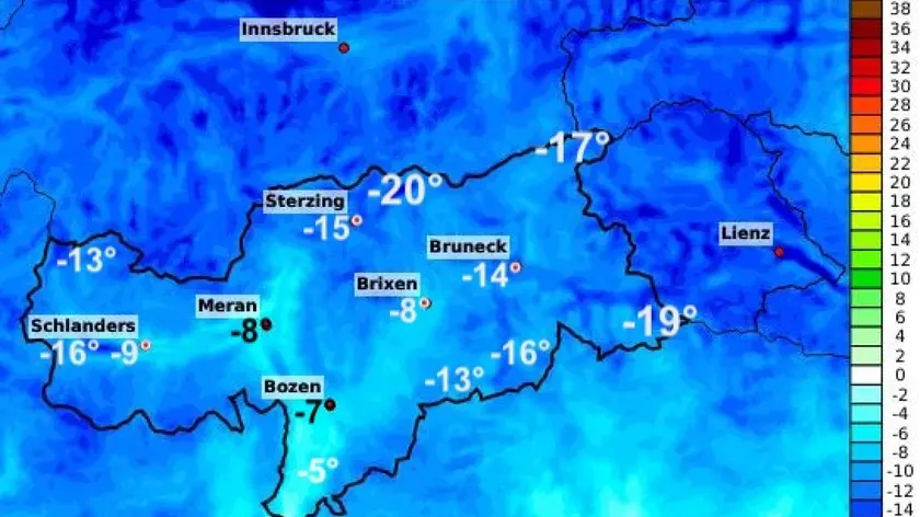 (ANSA) - BOLZANO, 05 GEN - L'Alto Adige ha registrato la notte più fredda di questo inverno con -20 gradi a San Giacomo in val di Vizze e -19 gradi a Sesto Pusteria, il paese di Jannik Sinner. Nei prossimi giorni non è in vista un sostanziale cambiamento. Per martedì, la giornata dell'Epifania, si prevede tempo in prevalenza soleggiato. Vento freddo da nord. Anche mercoledì il tempo sarà soleggiato con temperature basse. A nord il clima sarà ancora ventoso. La giornata di giovedì inizierà con tempo molto soleggiato ma con tendenza ad aumento della nuvolosità da nordovest in giornata. Verso sera e nella notte successiva saranno possibili delle nevicate sulla cresta di confine. Venerdì cielo tra irregolarmente e molto nuvoloso. (ANSA).