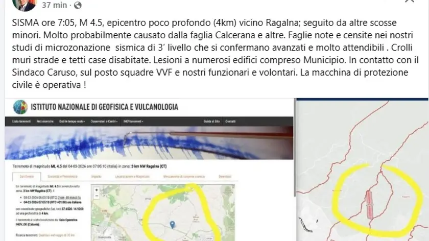 (ANSA) - CATANIA, 04 MAR - Il sisma di magnitudo 4.5 registrato alle 7.05 sull'Etna, vicino a Ragalna, seguito da altre scosse di minore intensità, "molto probabilmente è stato causato dalla faglia Calcerana e altre faglie note e censite nei nostri studi di microzonazione sismica di terzo livello che si confermano avanzati e molto attendibili" ha causato "crolli di muri di strade e tetti case disabitate" e "lesioni a numerosi edifici, compreso il Municipio". Lo scrive su Facebook Salvo Cocina, capo dipartimento della Protezione civile regionale, che è in contatto col il sindaco Caruso. Sul posto, segnala Cocina, sono presenti squadre dei vigili del fuoco e nostri funzionari e volontari. "La macchina di protezione civile - conclude - è operativa". (ANSA).