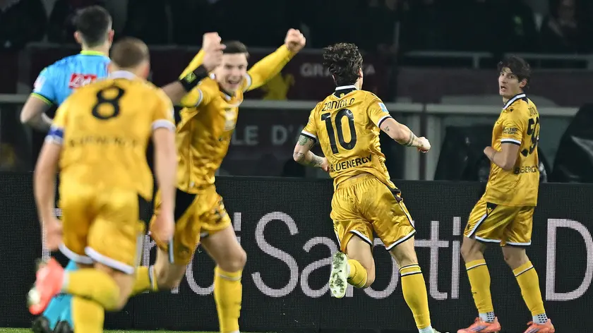 (ANSA) - ROMA, 07 GEN - L'Inter batte 2-0 il Parma al Tardini ed allunga a +4 sul Napoli approfittando così del pareggio casalingo dei partenopei con il Verona. I nerazzurri gestiscono l'incontro e regolano i ducali con i gol di Dimarco nel primo tempo e Marcus Thuram nel recupero del secondo tempo. Finisce 2-2 tra Lazio e Fiorentina. I biancocelesti passano in vantaggio con Cataldi all'inizio del secondo tempo ma non riescono a chiudere l'incontro. I viola prima pareggiano con Gosens, poi passano addirittura in vantaggio con un rigore trasformato da Gudmundsson all'89'. In pieno recupero arriva il pareggio di Pedro, sempre su rigore. L'Udinese vince in casa del Torino. Ancora in gol Zaniolo, alla sua quinta firma stagionale, per i friulani. Raddoppia Ekkelenkamp. In chiusura Casadei riaccende le speranze per i granata ma è tardi e finisce 2-1 per gli ospiti. (ANSA).