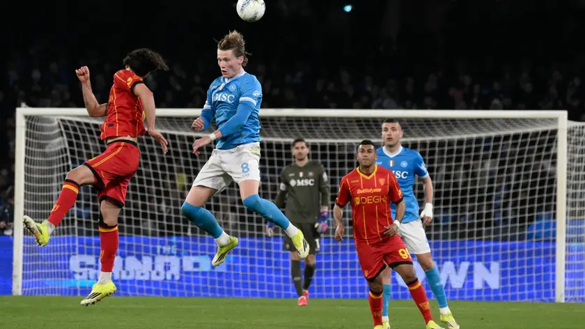 (ANSA) - ROMA, 14 MAR - Napoli-Lecce 2-1. Al Maradona avvio shock per il Napoli: il Lecce parte fortissimo e lo sorprende dopo 3', con Siebert che la sblocca di testa su angolo. Poco dopo Banda pericoloso e Tiago Gabriel che, ancora di testa da corner, sfiora il raddoppio. Dopo l'intervallo Conte inserisce McTominay e De Bruyne e il Napoli impiega 50 secondi per pareggiare con Hojlund. Al 67' Politano la ribalta sugli sviluppi di un corner. (ANSA).