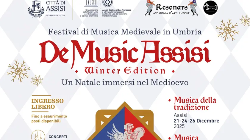 (ANSA) - ASSISI (PERUGIA), 29 DIC - Entra nel vivo "DeMusicAssisi Winter Edition", versione invernale del festival nato tre anni fa nella città serafica con l'obiettivo di rendere popolare la musica medievale. L'iniziativa è promossa dal Comune di Assisi, con la direzione artistica dell'Accademia d'arti antiche Resonars, nell'ambito degli eventi natalizi. Dopo l'apertura fra il 21 e il 26 dicembre scorsi con musica della tradizione e zampognari, dal 2 al 5 gennaio 2026 ci sarà un vero e proprio tuffo nel Medioevo con concerti, laboratori, spettacoli e una sorta di Capodanno medievale, con un banchetto storico in musica. Gli eventi - quasi tutti con ingresso libero, fino ad esaurimento posti disponibili - si svolgono in varie location del centro storico, immerso nell'atmosfera del "Natale di pace, luce, incontro". Il tema è "Il giovane Francesco", con l'idea di vivere l'Assisi medievale attraverso la musica al tempo di Francesco, con la tradizione cavalleresca, il racconto di gesta eroiche, la nascita delle confraternite, l'avvento della rivoluzione culturale portata dal francescanesimo. Si parte il 2 gennaio con corsi di musica antica sulle laudi polifoniche del '400, presso la sede dell'accademia Resonars, che proseguiranno anche il 3 e il 4 con concerto finale. Sempre il 2 gennaio, alle 17.00, in Pinacoteca comunale, "Lo joi d'amore, il sogno cortes di Francesco", concerto di musica medievale dell'ensemble "I Trobadores". Il 3 gennaio, alle ore 21.00 nella Sala delle Volte, un modo alternativo e originale per festeggiare il nuovo anno: "Il banchetto dei folli", banchetto storico con spettacolo musicale e partecipazione attiva del pubblico. Si tratta della riproposizione di una delle feste più note del Medioevo, la celebrazione del capovolgimento della realtà, un gioco antico tipico degli ultimi giorni del mese di dicembre, con cibo, racconti, canti, indovinelli, musica e performance teatrali. Costo 40 euro a persona, prenotazione obbligatoria info@accademiaresonars.it; +39 371 5541366. Il 4 gennaio, dalle ore 16.00, "Laudar Vollio. L'antico canto delle Laudi duecentesche", concerto itinerante nei vicoli di Assisi. Il 5 gennaio, alle ore 18.00, nell'abbazia di San Pietro, "Laudiam l'amor divino. Le laudi polifoniche del Quattrocento", concerto di fine masterclass. Alle 21.15, nella sede dell'accademia Resonars, è in programma la presentazione del nuovo disco dell'Ensemble Emyolia: "Al Alba d'un Dia Echi d'Aragona nella Napoli del Quattrocento". (ANSA).