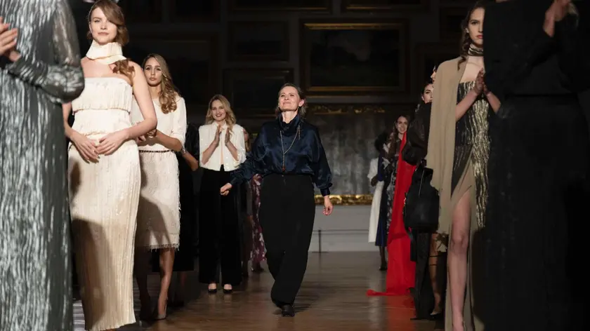 (di Patrizia Vacalebri) (ANSA) - ROMA, 19 DIC - La sfilata nella Galleria d'Arte Moderna (Gnam) della collezione di Daniela Otea, stilista romena invitata alla presentazione nell'Anno culturale Romania Italia 2026, ha reso omaggio a Palma Bucarelli, storica e critica d'arte, iconica direttrice della Galleria Nazionale d'Arte Moderna e Contemporanea (Gnam) dal 1942 al 1975. Un omaggio dovuto avvenuto proprio nella sede museale a cui Palma Bucarelli diede la sua impronta astrattista e informale. Presenti all'evento, intitolato "Lo Stile di Palma - Arte, Moda e Musica al tempo di Palma Bucarelli", condotto da Nino Graziano Luca che ne ha firmato anche la direzione artistica, promosso dalla presidenza della Commissione Cultura della Camera dei Deputati, con il patrocinio dell'Ambasciata di Romania in Italia e della Società Italiana degli Autori ed Editori (SIAE), organizzato dalla Compagnia Nazionale Danza Storica, la direttrice della Gnam Cristina Mazzantini, Gabriela Dancau, ambasciatrice della Romania in Italia, Francesca Del Bello, presidente del II Municipio, di Salvatore Nastasi, presidente della Società Italiana degli Autori ed Editori, Federico Mollicone, presidente della commissione Cultura, Scienza ed Istruzione della Camera dei Deputati, professor Roberto Giuliani docente di musica, mass media e metodologia della ricerca al Conservatorio Santa Cecilia di Roma. La direttrice Cristina Mazzantini ha evidenziato il legame indissolubile tra Palma Bucarelli e la Gnam, ricordandone la visione museale d'avanguardia. La presidente del II Municipio, Francesca Del Bello ha rimarcato invece la rilevanza dell'iniziativa nel panorama cittadino. L'ambasciatrice della Romania in Italia ha celebrato il ponte culturale tra le due nazioni. Il presidente Federico Mollicone ha esaltato il ruolo di Palma Bucarelli la cui lungimiranza ha guidato la rinascita artistica italiana. Oltre alla sfilata, la lettura di alcune lettere d'amore scritte da Palma Bucarelli a Paolo Monelli, è stata alternata a due performance di danza contemporanea sul tema "Lo stile di Palma" eseguite per la Compagnia Nazionale di Danza Storica, da Alessandro Trazzera e Rebecca Erroi, con la regia artistca di Nino Graziano Luca. La collezione di Daniela Otea ha puntato a una reinterpretazione della forza estetica di Palma Bucarelli, immaginandola nel nostro tempo, nelle diverse occasioni della giornata, restituendone il carattere deciso, la sofisticazione intellettuale e la sua innata eleganza. Hanno sfilato abiti chemisier blu notte, gonne a pieghe anni Cinquanta color piombo, jumpsuit in sete morbide e luminose, camicie in chiffon con fiocco, completi in cashmere finissimo, spolverini e lunghi gilet in organze leggere. I tailleur sono in velluto a coste o in tessuti laminati lavorati con sfumature pittoriche di verde e di marrone. Per la sera, i completi in colori cangianti e metallici, che mutano secondo la luce e l'angolo di osservazione, si sono alternati ai completi anni Settanta rosso fuoco. (ANSA).