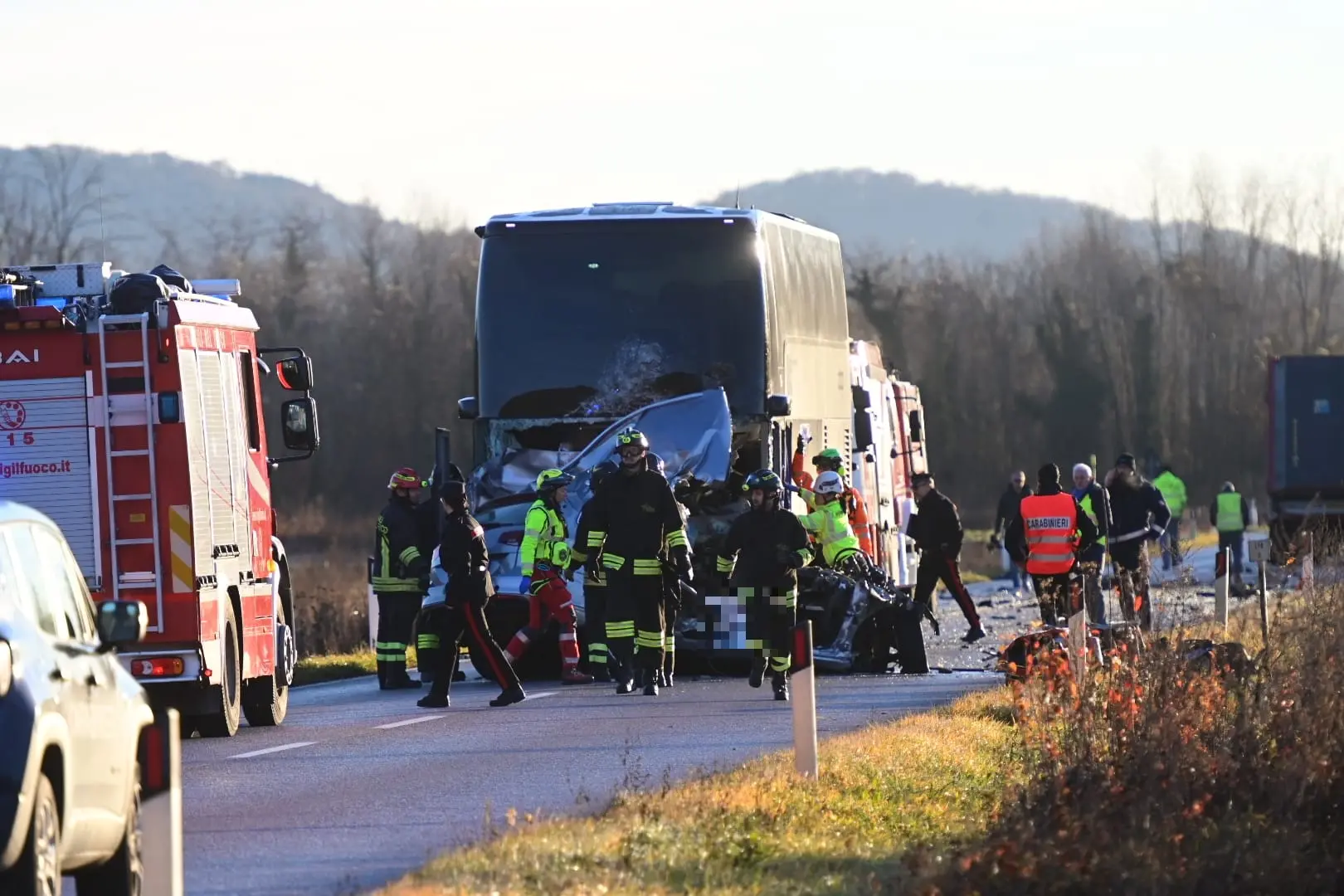 Sono stati i pompieri i primi a intervenire per estrarre dagli abitacoli dei mezzi i due conducenti intrappolati nelle lamiere contorte. Per Floriduz, alla guida della Volkswagen Passat, non c’è stato nulla da fare, è deceduto all’istante. Per circa due ore i vigili del fuoco hanno lavorato senza sosta per liberare l’autista incastrato nell’autobus, poi affidato all’equipaggio dell’elicottero.