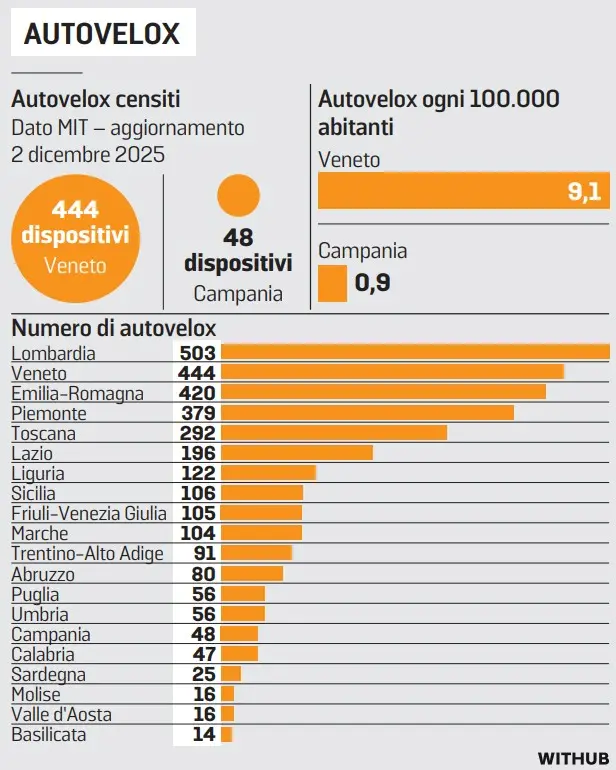 Ma il dato non è diverso se si guarda a una più generale differenza tra le principali regioni del Nord e quelle del Sud: in Lombardia, che pure conta circa il doppio degli abitanti del Veneto (10 milioni contro i 4,8 milioni del Veneto) gli autovelox – secondo lo stesso Ministero dei Trasporti – sono 503, il Lazio (5,7 milioni di cittadini) ne ha 196. L’Emilia Romagna (4,4 milioni di abitanti) conta 420 impianti a fronte dei 106 della Sicilia che ha 4,78 milioni di abitanti.