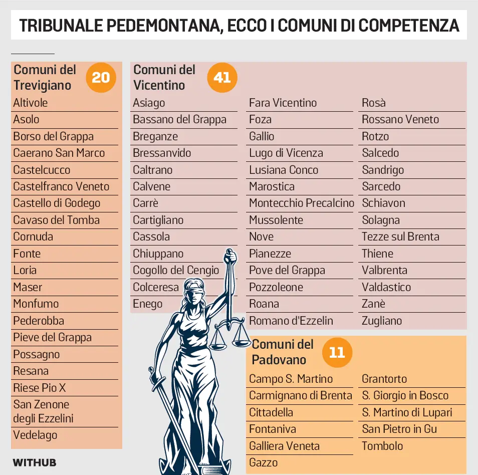 Il ritorno ai “tribunalini” dopo la cura dimagrante del 2012 che aveva portato alla soppressione di 220 sezioni staccate in tutt’Italia, trova la sua attuazione in Veneto nella riedizione di Bassano. Che andrà a erodere territori ai tribunali delle province vicine. Per l’esattezza il nuovo Palazzo di Giustizia fagociterà 20 Comuni del Trevigiano e 11 del Padovano; ad esso faranno inoltre capo 41 del Vicentino (vedi infografica). I cittadini di Castelfranco o di Cittadella, per fare alcuni esempi, non si rivolgeranno più ai tribunali delle province di appartenenza, ma a quello bassanese. E tale passaggio riguarderà anche alcuni Comuni vicentini.