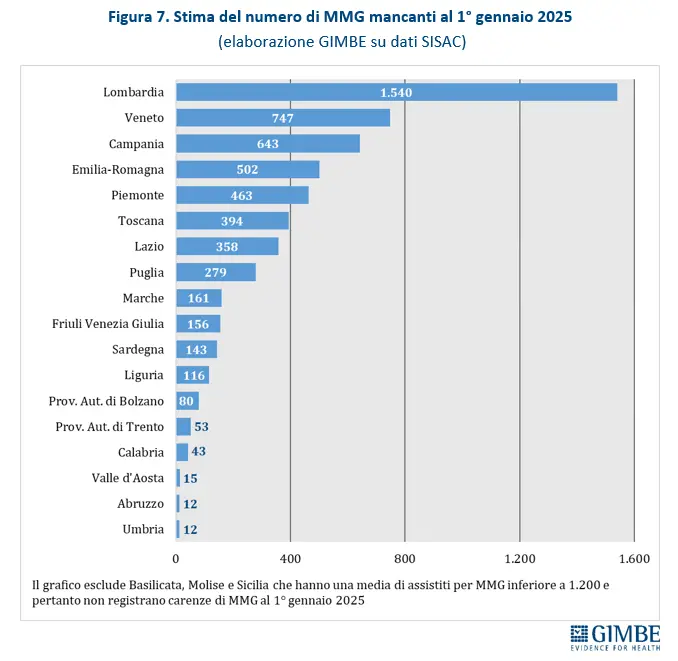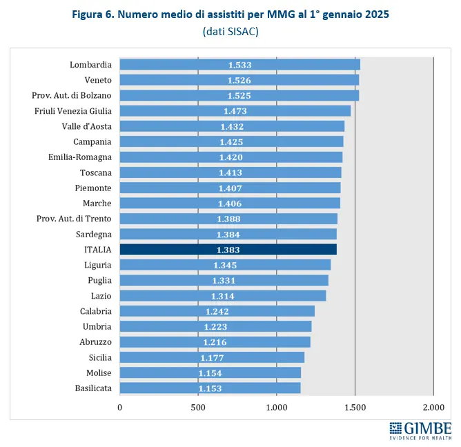 Ogni medico di base segue in media 1.383 assistiti, ben al di sopra del rapporto ottimale di 1.200 pazienti per medico, con alcune situazioni locali che superano addirittura i 1.500 assistiti.