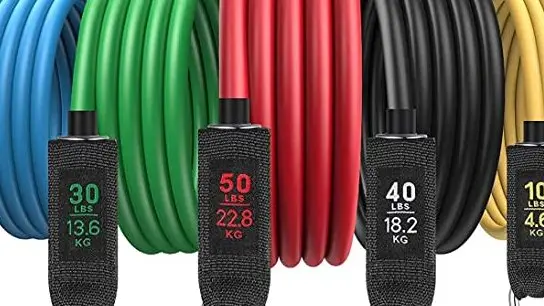 4. FitBeast (euro 40) sono 5 fasce di resistenza, realizzate in lattice di alta qualità e maniglie che aiutano a prevenire efficacemente il dolore alle mani durante l’allenamento. Ogni fascia è lunga 208 cm e presenta un peso diverso, segnato su ognuna. Ci piacciono perché comprendono 12 settimane di tutorial di esercizi professionali: fanno risparmiare il tempo necessario per fare una scheda di allenamento e aiutano ad allenarsi in modo più diretto ed efficace.